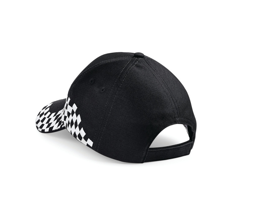 Broderie drapeau à damiers. Fermeture par Rip-Strip®. Parfaite pour la sérigraphie et la broderie. Tour de tête : 58cm. Visière en polyéthylène recyclé, un matériau résistant, léger et flexible.