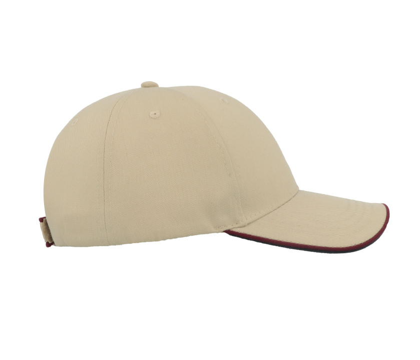 6 panneaux. Fermeture par Velcro®. Passepoil sur la visière et sur la patte de réglage. Visière contrastée et préformée. Œillets surpiqués. 4 coutures sur la visière. Tour de tête : 58cm. Structure de la visière en plastique.