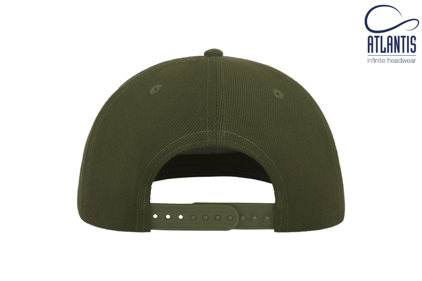 5 panneaux. Visière plate. Panneau avant renforcé. Sticker sur la visière. 6 coutures sur la visière. Oeillets surpiqués. Bandeau: 35% coton/65% polyester. Fermeture en pvc. Tour de tête : 58cm. Structure de la visière en plastique.