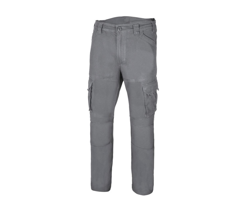 Fermeture à bouton avec braguette zippée. Tissu arrière renforcé. Renfort sur les genoux. Taille élastiquée sur les côtés. Ceinture plus haute à l'arrière. Triple couture de sécurité. 8 poches.