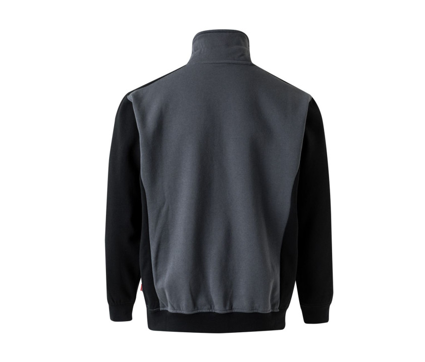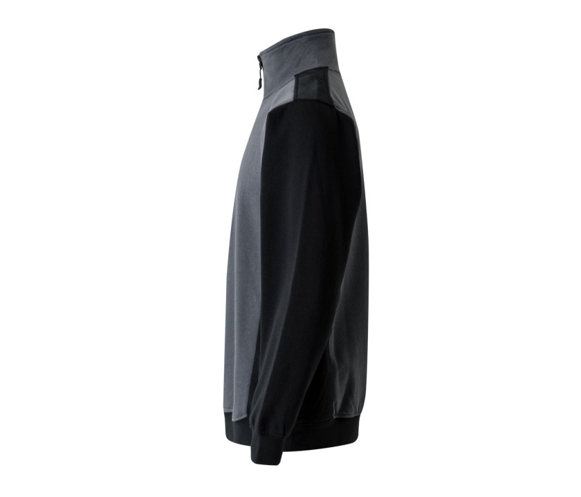 Col montant zippé. Manches, épaules, côtés, intérieur du col et bas du sweat contrastés. Poignets et taille en bords côte. Traité anti-peluche.