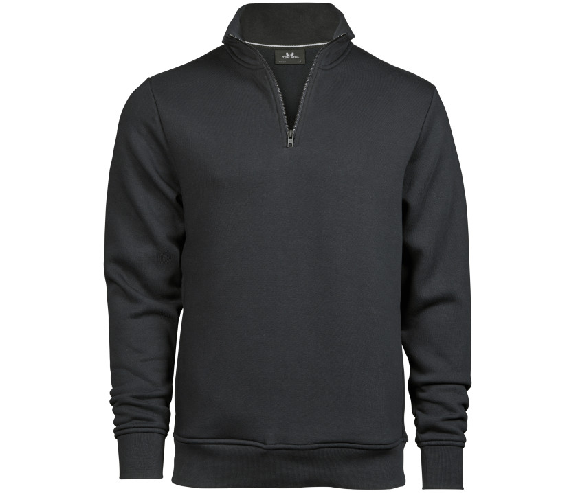Sweat col zippé lourd. Col, taille et poignets en bords côte avec Lycra®. 2 poches latérales. Intérieur brossé. Teinté 2 fois. Lavable à 60°C.