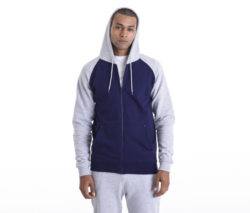 - Manches raglan contrastées. Capuche doublée avec cordon plat contrasté. Zip en plastique. Intérieur gratté.