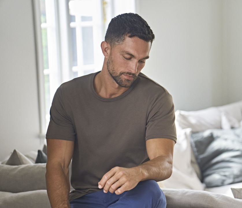 Tee-shirt homme - Coupe ajustée. Col en bord côte étroit. Double couture. Lavé aux enzymes.