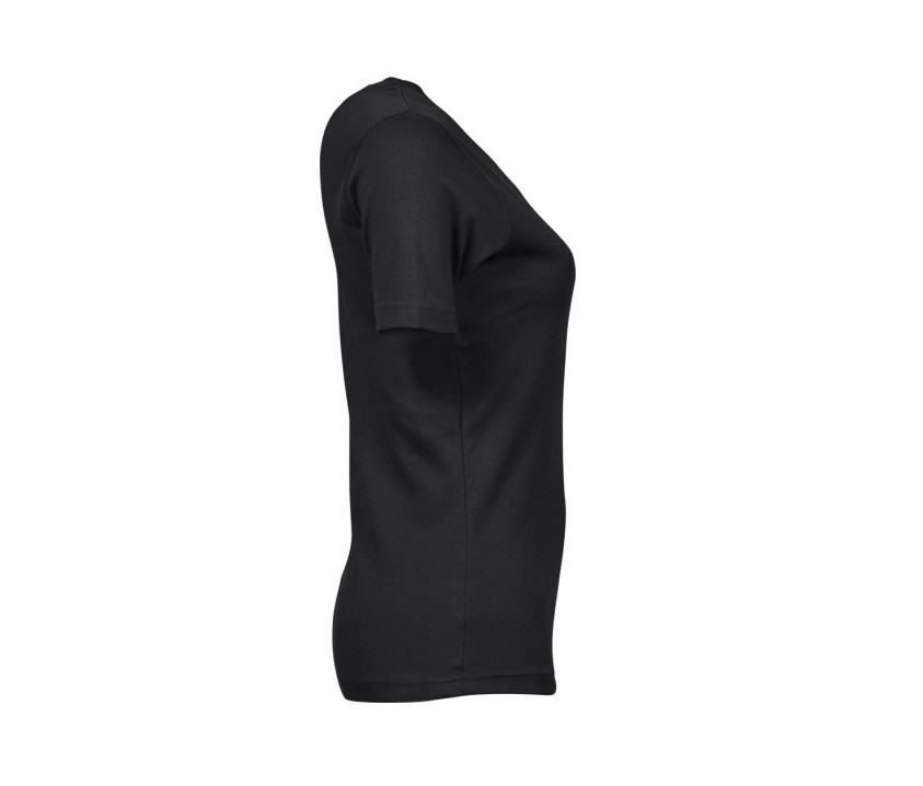Tee-shirt femme - Coupe ajustée. Col en bords côte. Double couture. Lavé aux enzymes.